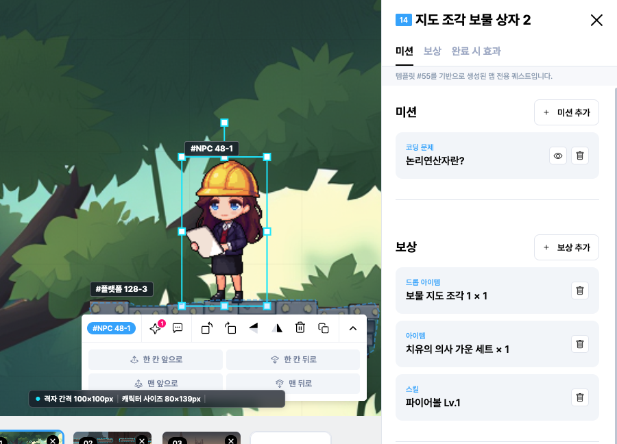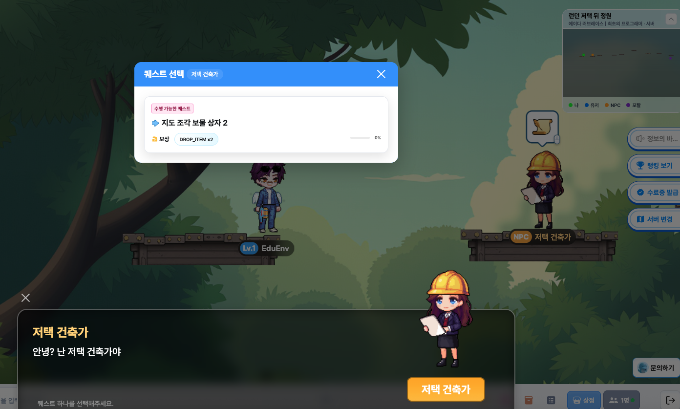 아이들은 NPC에게 퀘스트를 받고, 코딩으로 문제를 해결하며 다음 단계로 나아가게 됩니다.